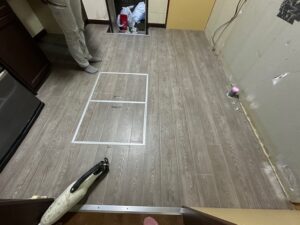 柄物のクッションフロアは、同じ品番でも“向き”が違うと光の反射で色が違って見えたり、目地が斜めに見えてしまうことがあるので継ぎ目やつなぎ位置を先に計画しておくと、完成後の“ズレ感”が出にくくなります。