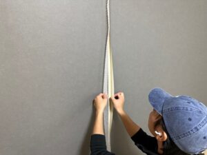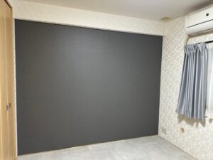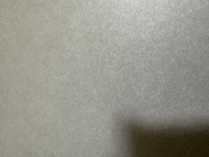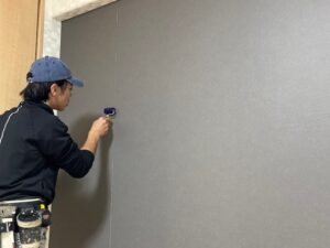グレーの無地のクロスです。ジョイント部に和紙テープを入れています。和紙テープは、乾燥収縮による目開きや下地の影響を抑え、仕上がりの美しさと耐久性を底上げするひと手間です。