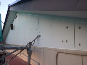 ↓ 昨日のパテ処理が乾燥しているのを確認したうえで、ケレン掛けを行い、 既存の外壁材との段差をなめらかにしていきます。