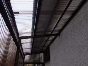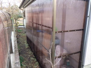 経年劣化などでひび割れや変色が見られたため、高い耐衝撃性を持つポリカボネート波板への交換となりました。