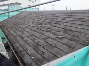 既存の屋根材は全体的に傷みが見られ、表面の劣化も進んでいる状態でした。 屋根材の傷みが進行すると、防水性が低下し、雨水の侵入につながる恐れがあります。