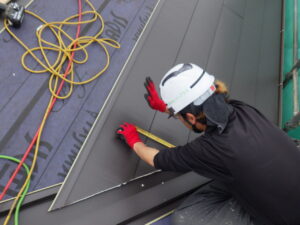 本日はその続きとして、屋根材本体である横暖ルーフSを、納まりを 確認しながら丁寧に張り進めていきます。