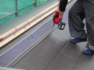 屋根材を張る工程では、ただ取り付けるだけでなく、寸法や通りを 見ながら施工を進めることが、仕上がりのきれいさと雨仕舞の良さにつながっていきます。