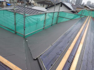 ↓ 午後から雨が降ってきてしまったため、本日は北面部分の施工を終えたところで作業終了となりました。 屋根工事は天候の影響を受けやすいため、無理に作業を進めるのではなく、その日の天候や 安全面を見ながら判断して進めることが大切です。