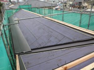 前回の作業で下地や防水処理までは完了しているため、本日は屋根材 本体の施工が中心となります。