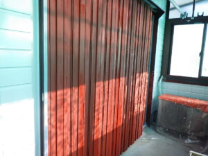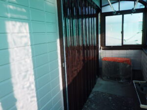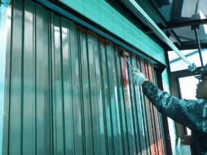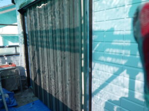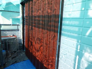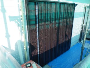 ベランダ雨戸・雨樋等の役物塗装になります。 雨戸はケレンをして、細かい傷を付けます。