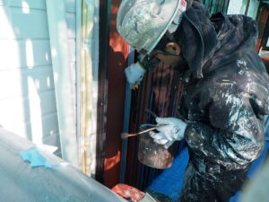外壁の上塗りが完了したので、養生を撤去して行きます。
