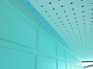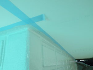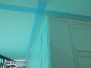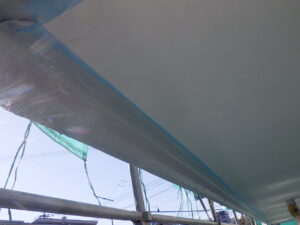 1階軒天との取り合い塗装になります。 マスキングで養生してから塗装して行きます。