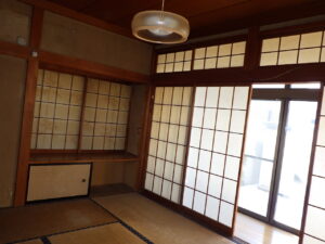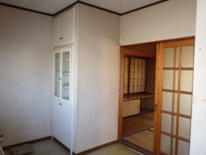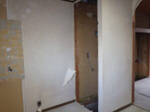 ↓ DKと和室をつなげてLDKにするため、まずは開口部まわりと、和室側にあった**収納棚(押入れ等)**の解体に入りました。