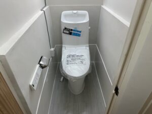 洋式トイレの設置が完了しました。しっかり固定し、洗浄・止水・水漏れが