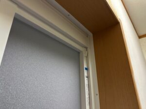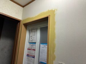 壁回復工事パテ処理 ユニットバス交換工事では、浴室の設置 だけで終わりではなく、入口まわりや 周辺壁の補修・復旧も大切な作業になります。