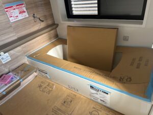 ユニットバス設置が終わりました。 まだ工事が続くため 養生がしてあります。