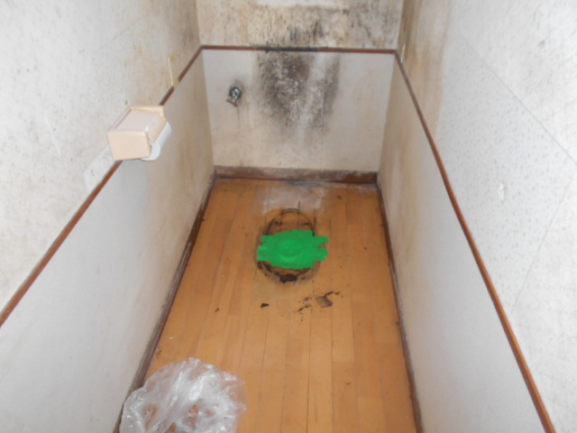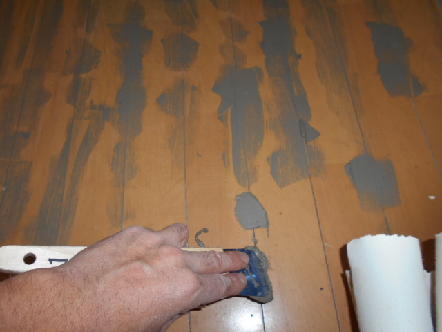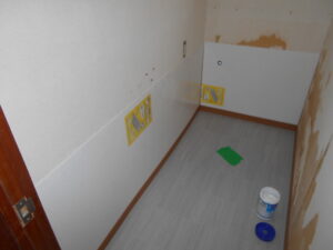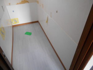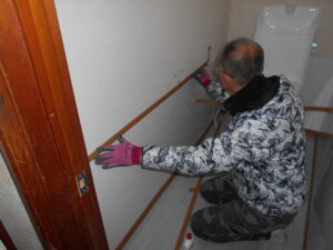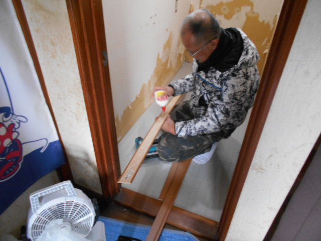 今回、トイレ床にCFを貼るのでフローリングのリブをパテ施工して不陸調整をして行きました。