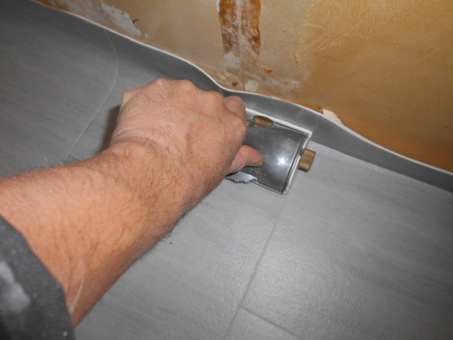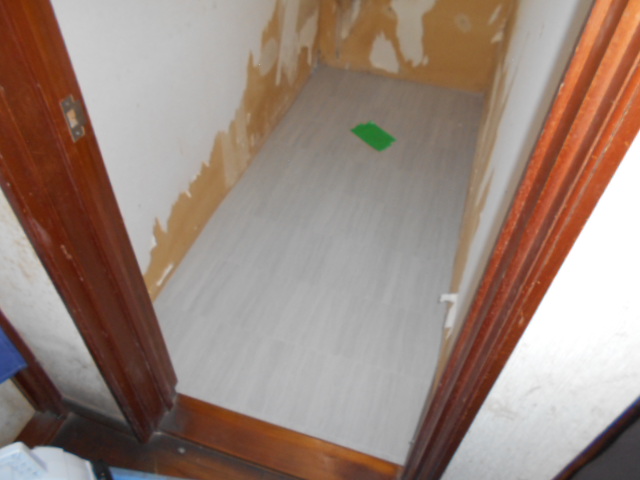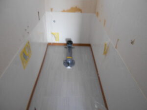 トイレ床CF貼りになります。 仮置きをして床の幅に合わせてカットして、形を整えて行きます。