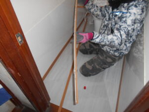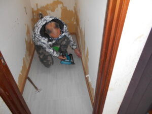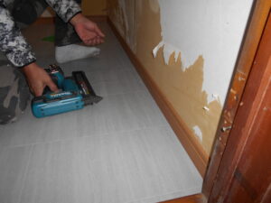 CF貼り完了後、巾木を床サイズに加工して、巾木裏に速乾ボンドを塗布してピンタッカーで壁下地に 打ち付けて固定して行きます。