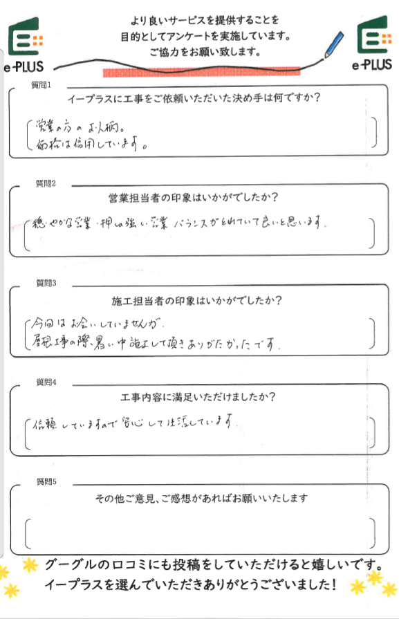 この度はアンケートにご協力いただき、誠にありがとうございます。 また、今回の工事だけでなく、以前より何度も弊社へ工事のご依頼をいただき、心より感謝申し上げます。 営業担当の対応や価格について「信頼している」とのお言葉をいただき、大変嬉しく思っております。