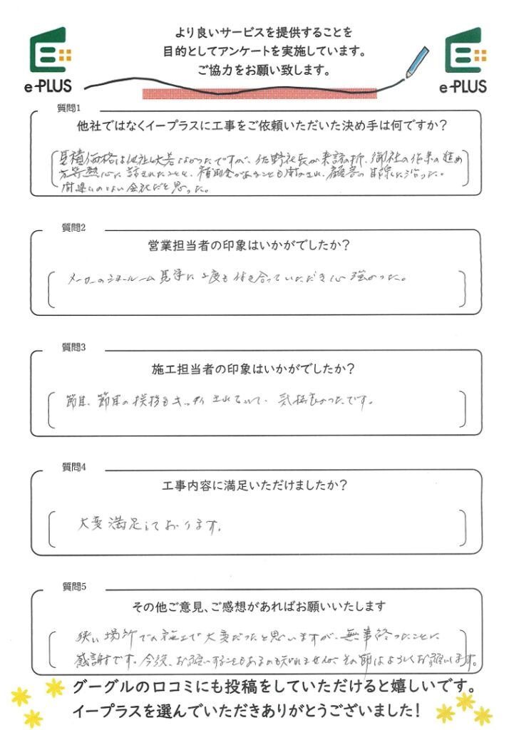 「大変満足しています」とのお声までいただき、スタッフ一同うれしい気持ちで拝読いたしました。作業へのお心遣いにも感謝申し上げます。