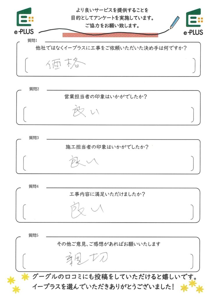 この度は工事のご依頼ならびにアンケートへのご協力、誠にありがとうございます。