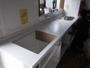 - ワークトップは扉やインテリアに合わせやすい人工大理石製